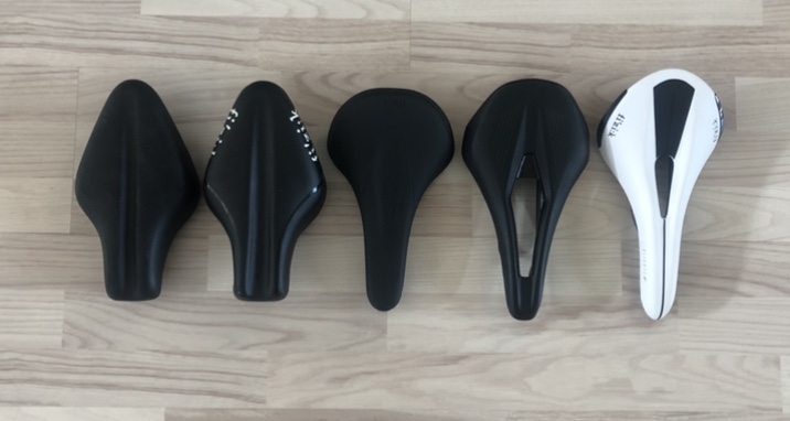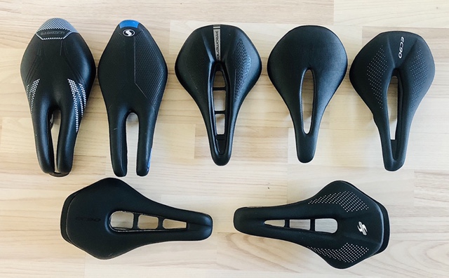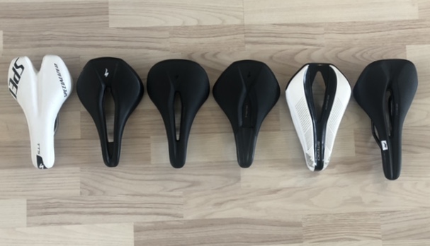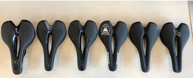 Nedenstående sadler er fra 6 forskellige mærker. Sadlerne ligner hinanden rigtig meget. Den første er lidt bredere/længere (154 mm. bred/250 mm. lang), hvor de øvrige ligger fra 142 til 148 mm. i bredde, med længder fra 240-245 mm. Padding på sadlerne, form & ergonomi er forskellige imellem de enkelte sadler, men forskellene er mindre.