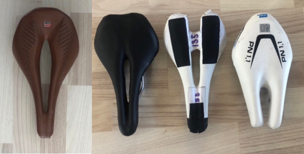 Tilbage da udvalget var langt mindre, end i dag, lavede vi vores egen sadel 245 mm. lang & 135 mm. bred (nr. 2 på billedet). Vi havde en gruppe, typisk kvinder med neutralt bækken og lille afstand imellem siddeknoglerne, som der ikke fandtes løsninger for. Siden er der kommet gode sadler, der dækker behovet og vi har ikke længere behov for at lave sadlerne selv.